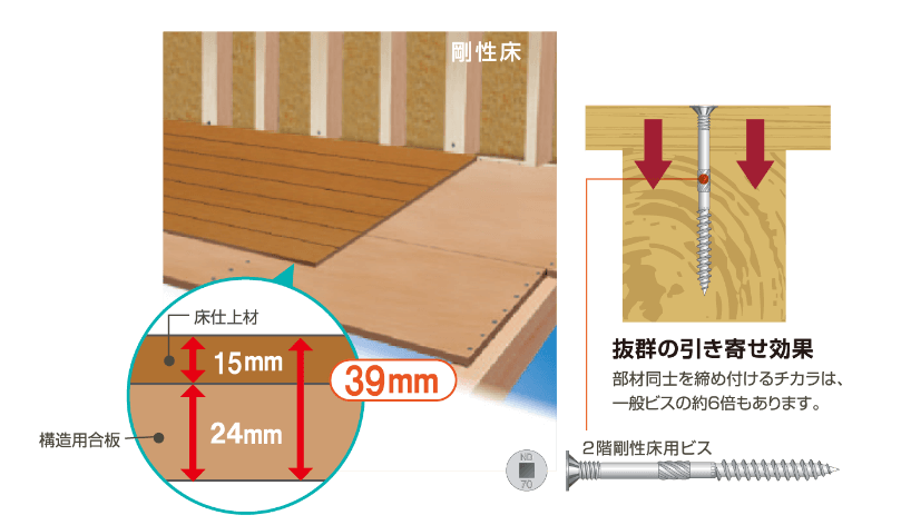 2階床には特殊な接合ビスを使用し、床倍率3.0倍を実現。